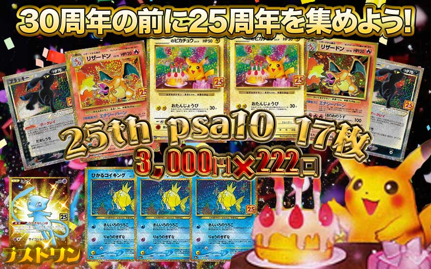 2025.11.2130周年の前に25周年を集めよう! ¥3,000 【30周年の前に25周年を集めよう!】 3000円✖️222口 大当たり🎯 ピカチュウ⚡️✖️2 リザードン🐉✖️2 ブラッキー🐕🦺✖️2 25th psa10 17枚🔥 コイキング🐟3匹 【ラスワン】 ミュウUR🪼 30周年の前に25周年を集めよう!個 お買い物カゴに追加 商品コード: oripa-006 カテゴリー: オリパ, ポケモン, 全ての商品 関連商品 ガールズオリパ ¥5,000 お買い物カゴに追加 TAGTEAMオリパ ¥10,000 お買い物カゴに追加 未開封オリパ ¥3,000 お買い物カゴに追加